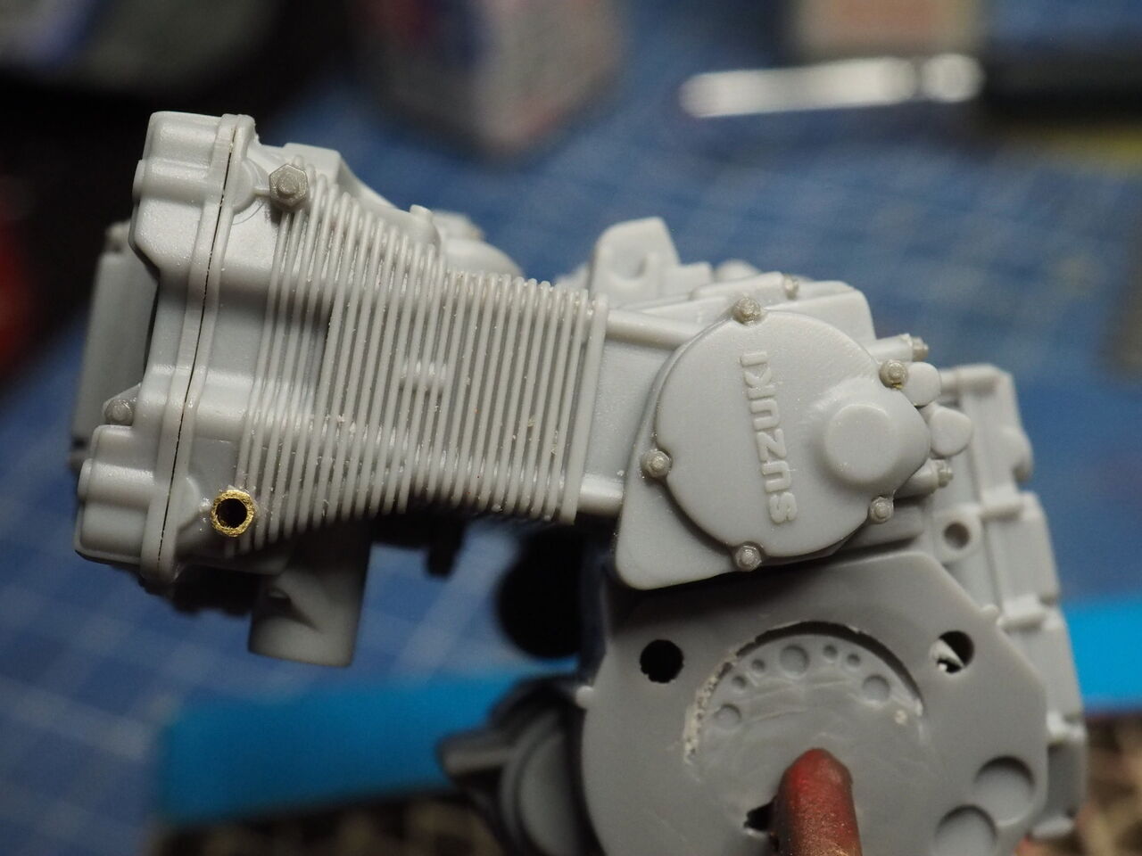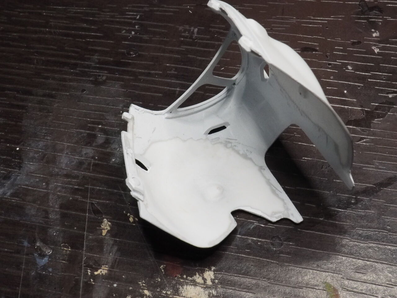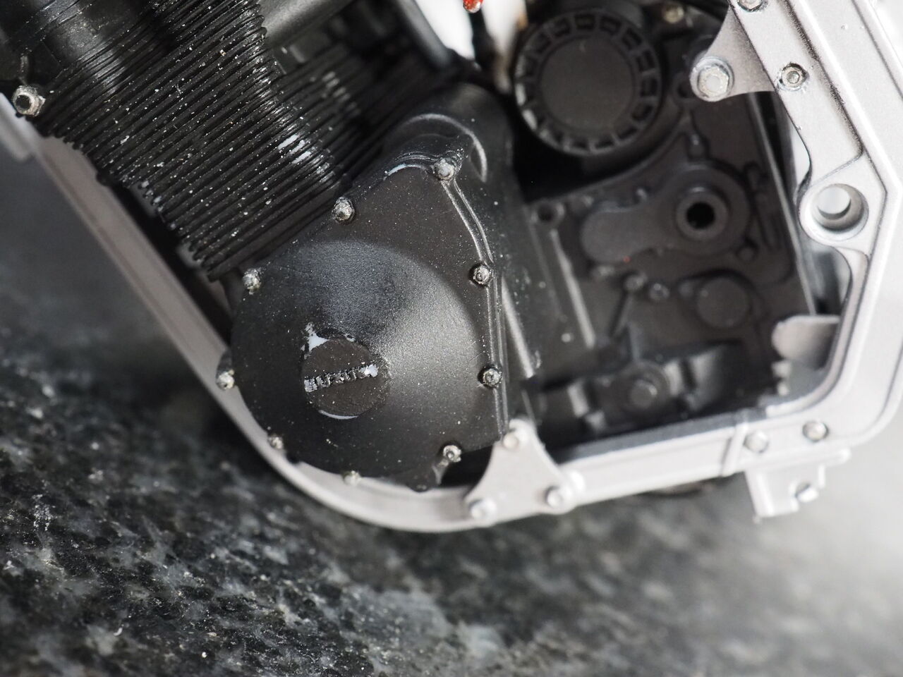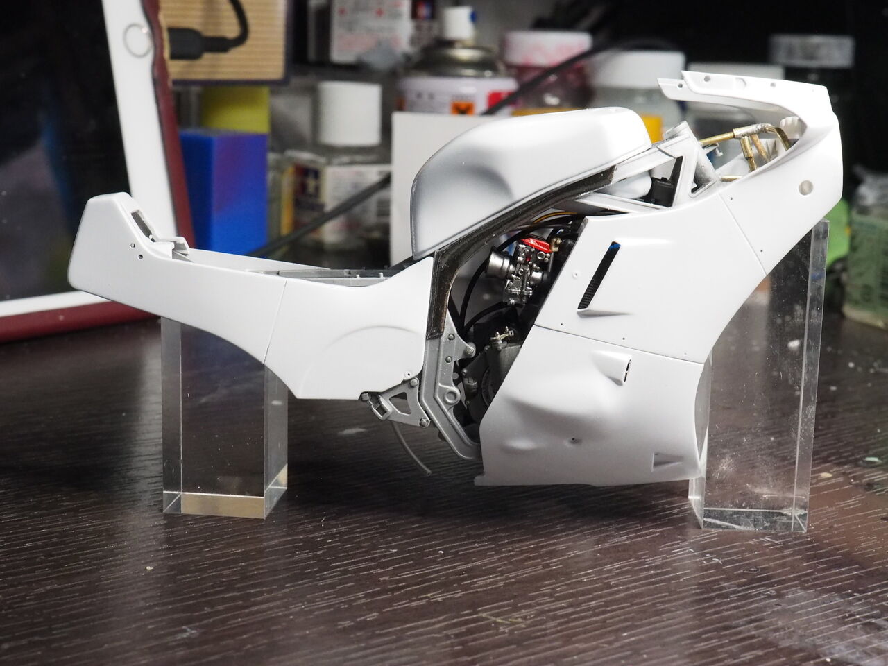 アンダーカウルですが、ここで判明した件があります。エンジン周りがキツすぎです。あまりにピッタリで塗装がやられてしまいます。ルーターで必死に削ります。測ってみると場所によって1mmも肉のある箇所があります。整形品の肉厚を考えると妥当な線なのでしょう。ですがキットの作り手からみるとクランクケースなど出っ張る部分の肉厚をもう少し薄くし、エンジンとのクリアランスをとってほしいです。