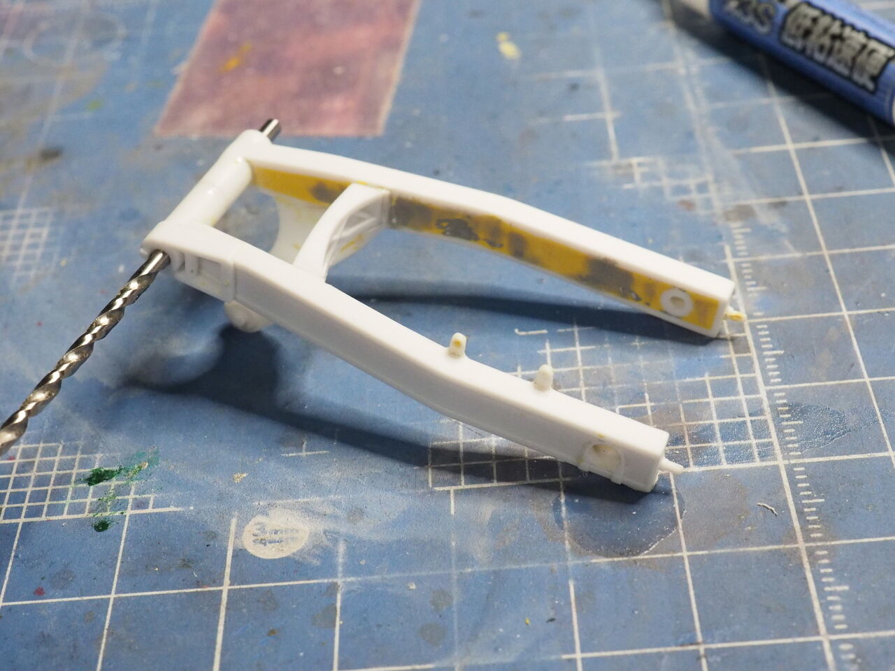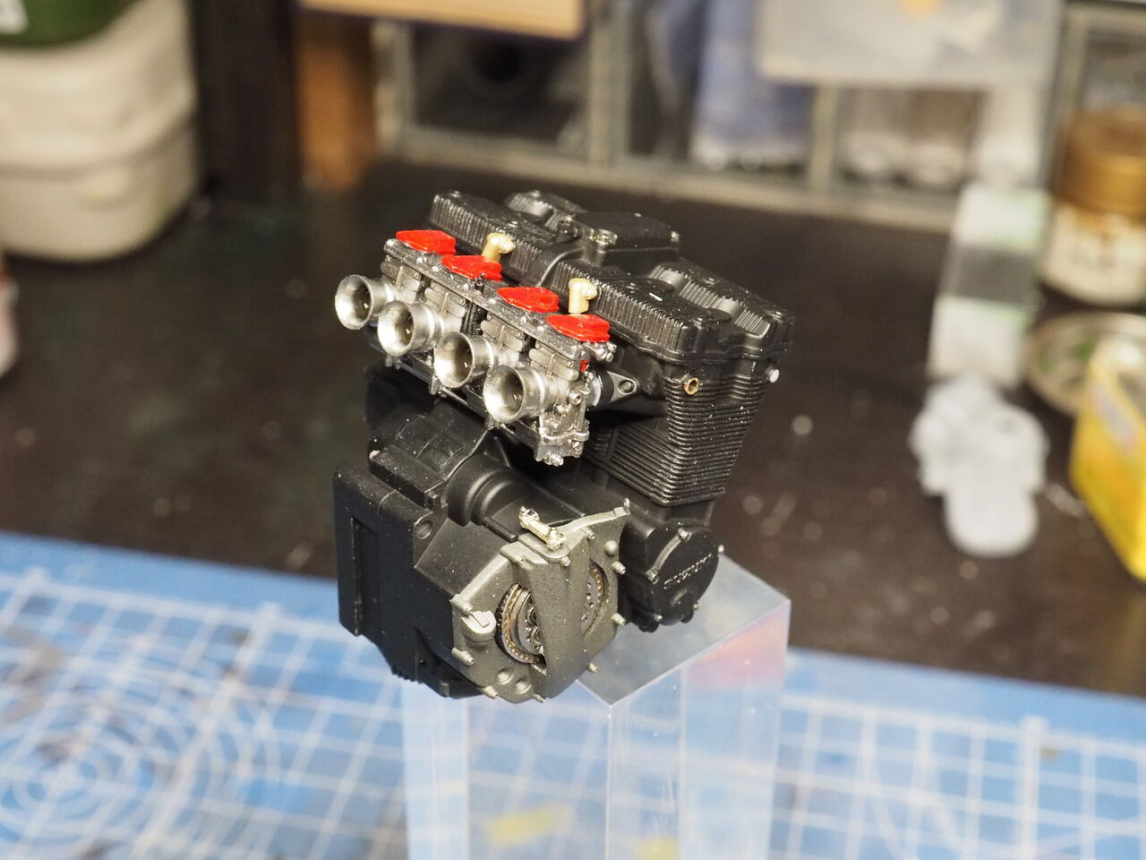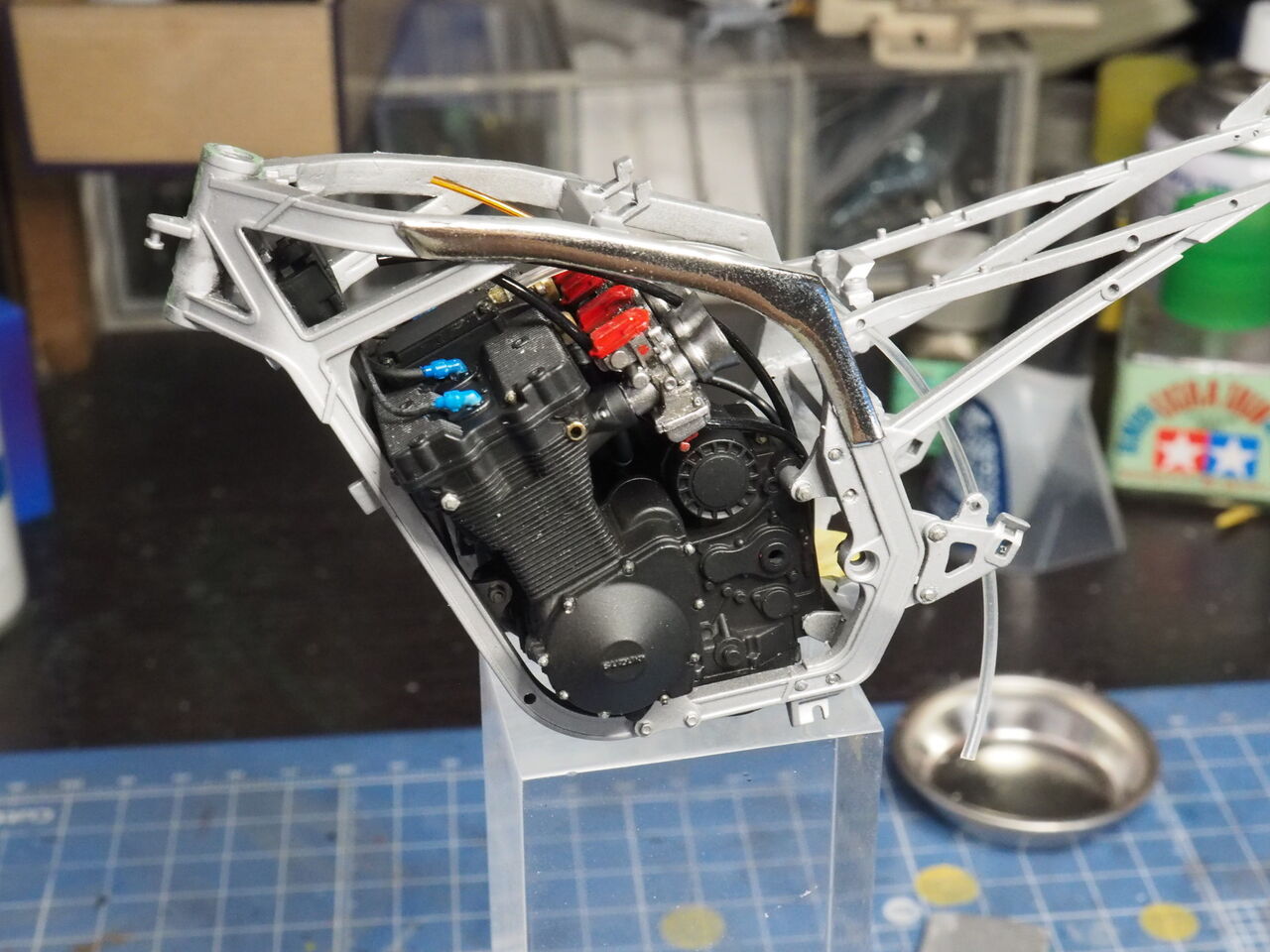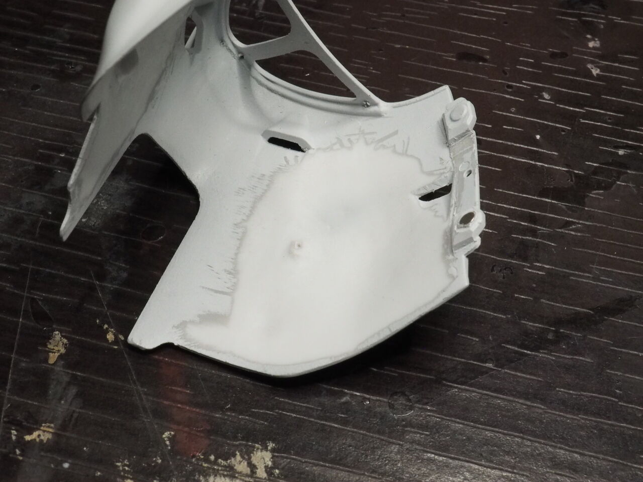 アンダーカウルですが、ここで判明した件があります。エンジン周りがキツすぎです。あまりにピッタリで塗装がやられてしまいます。ルーターで必死に削ります。測ってみると場所によって1mmも肉のある箇所があります。整形品の肉厚を考えると妥当な線なのでしょう。ですがキットの作り手からみるとクランクケースなど出っ張る部分の肉厚をもう少し薄くし、エンジンとのクリアランスをとってほしいです。