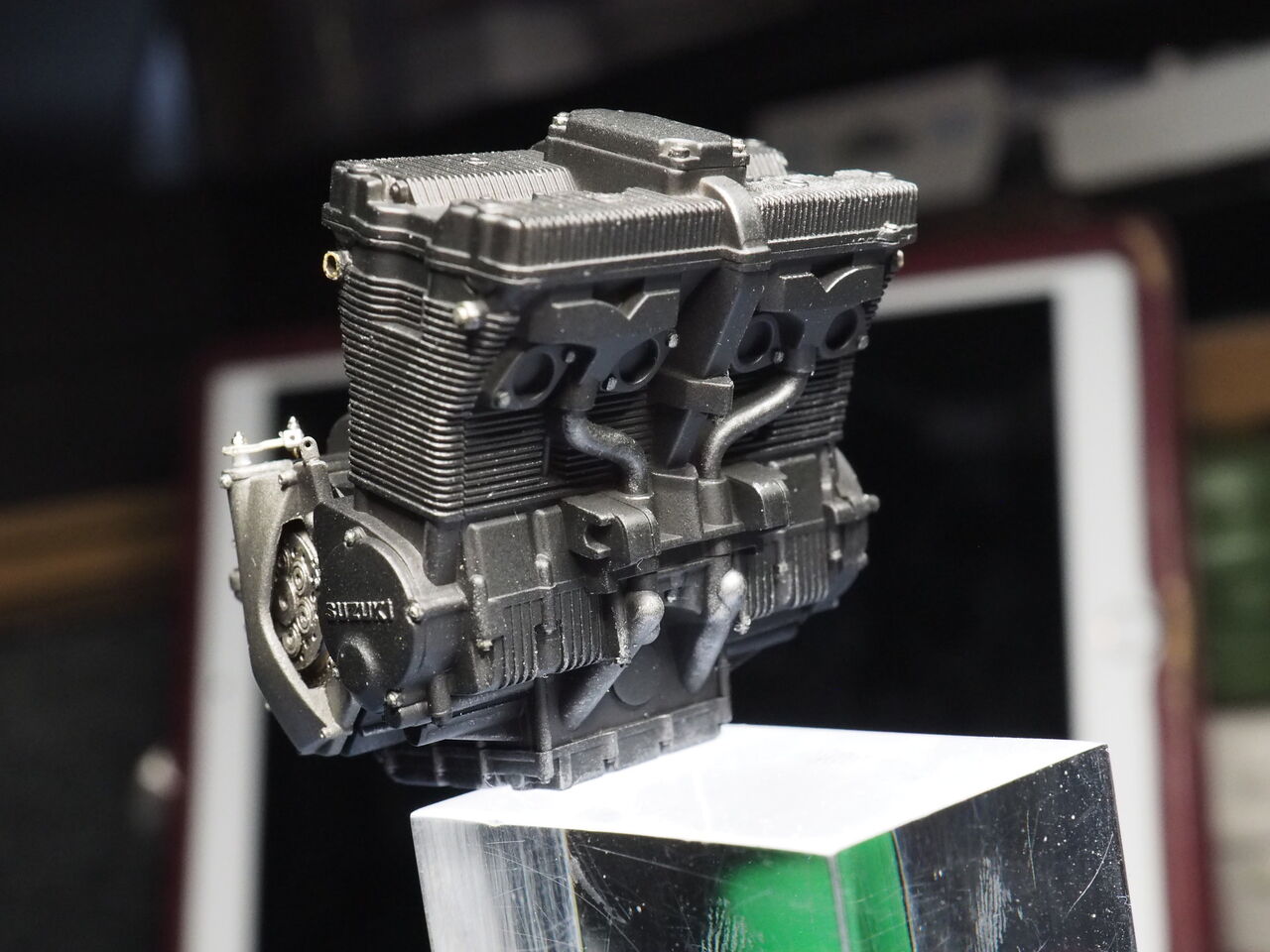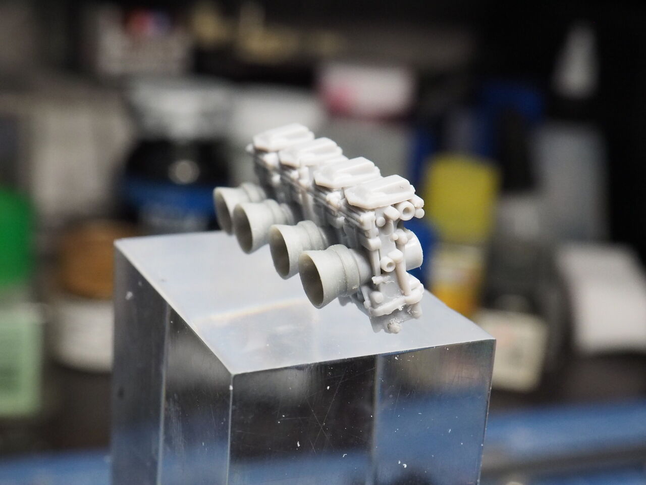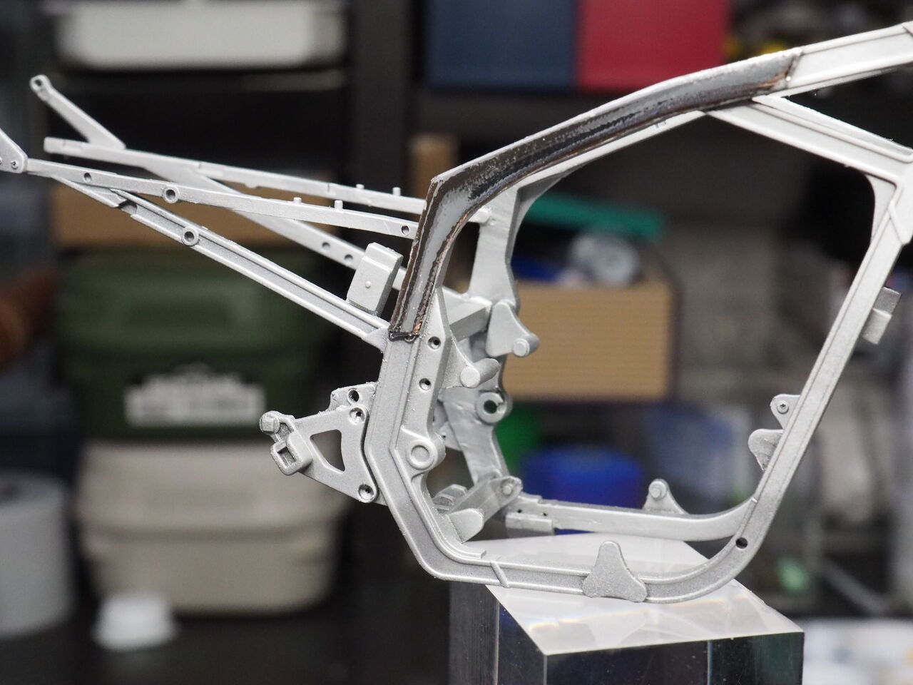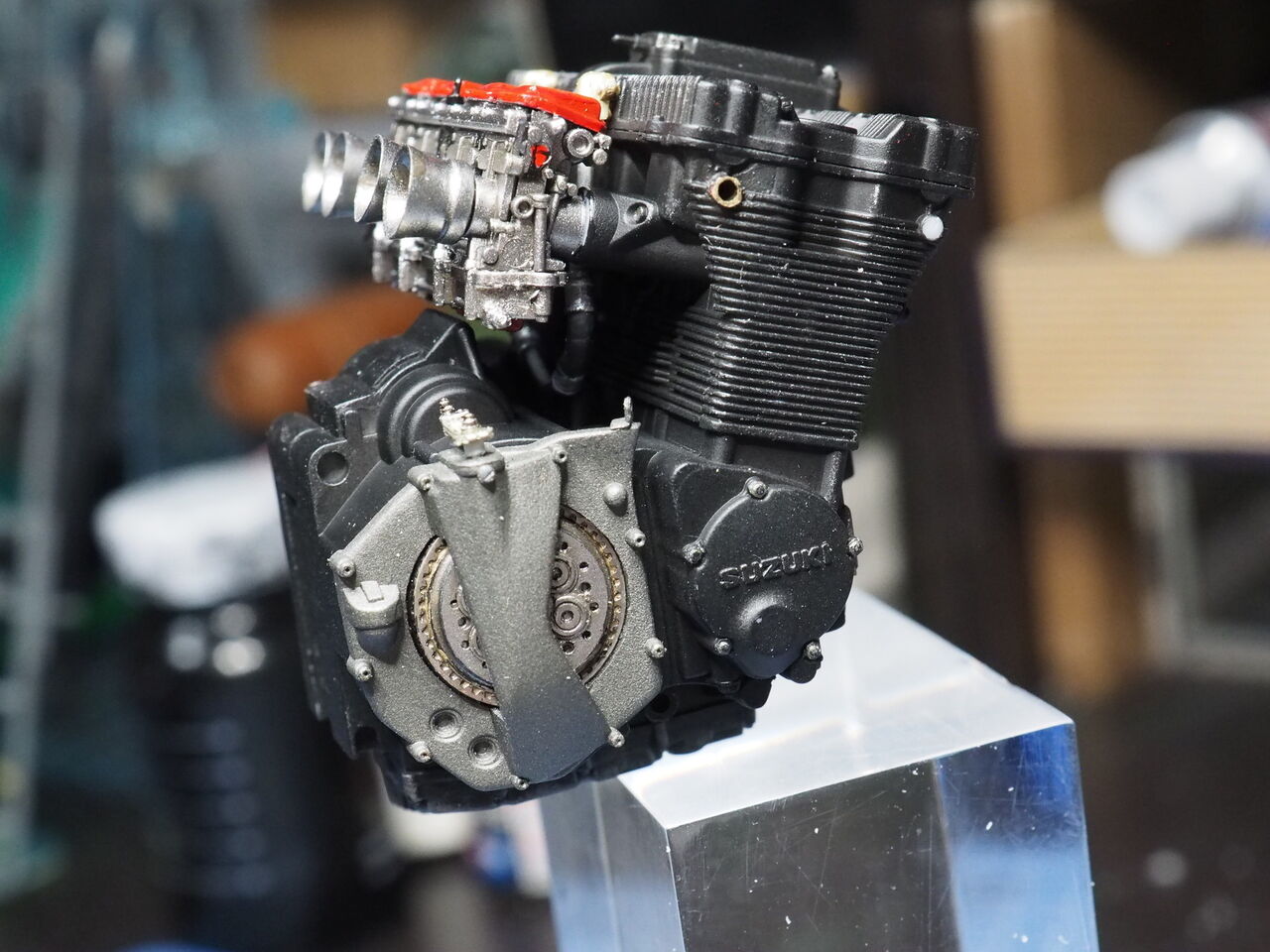 アンダーカウルですが、ここで判明した件があります。エンジン周りがキツすぎです。あまりにピッタリで塗装がやられてしまいます。ルーターで必死に削ります。測ってみると場所によって1mmも肉のある箇所があります。整形品の肉厚を考えると妥当な線なのでしょう。ですがキットの作り手からみるとクランクケースなど出っ張る部分の肉厚をもう少し薄くし、エンジンとのクリアランスをとってほしいです。