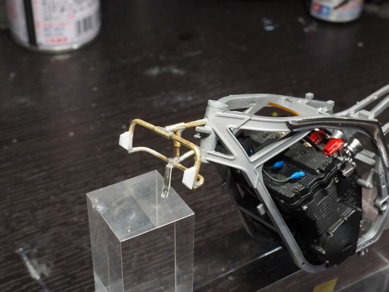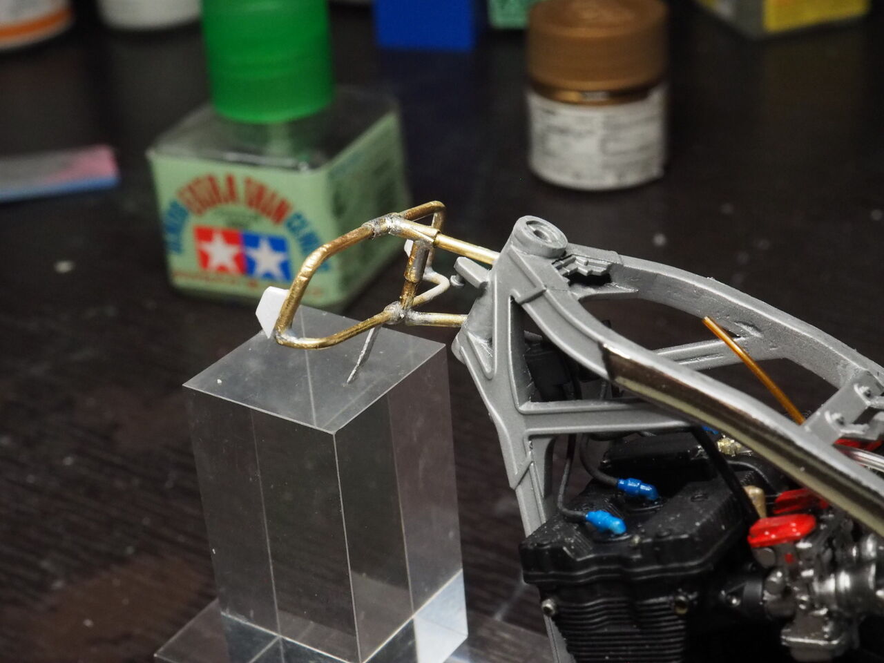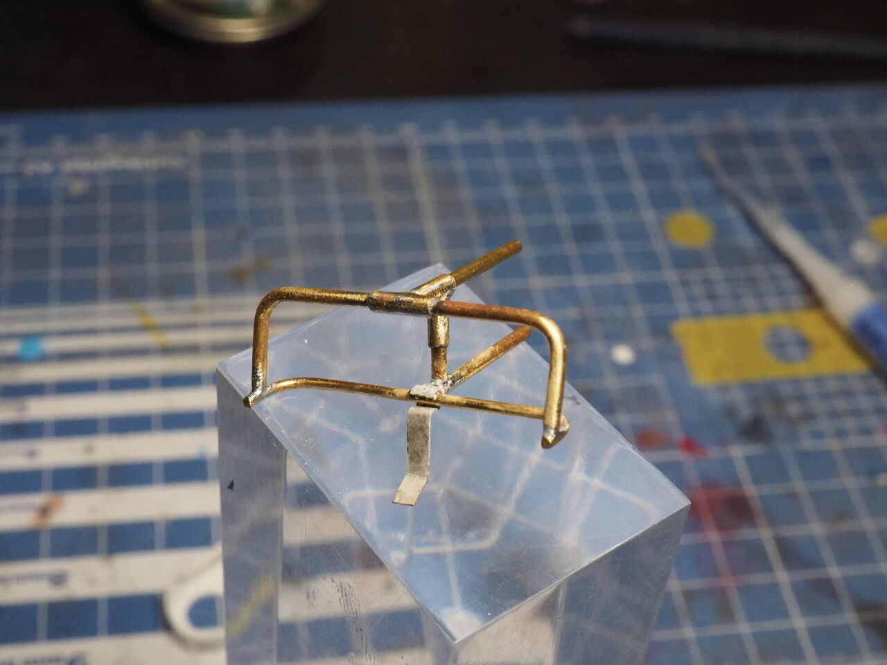 真鍮線でつくりました。ハンダ溶接です。なかなか寸法が合わなかったり平行や直角が出てなかったりと難航しました。こういった小さいものを綺麗に支える治具があるといいんですけども・・・