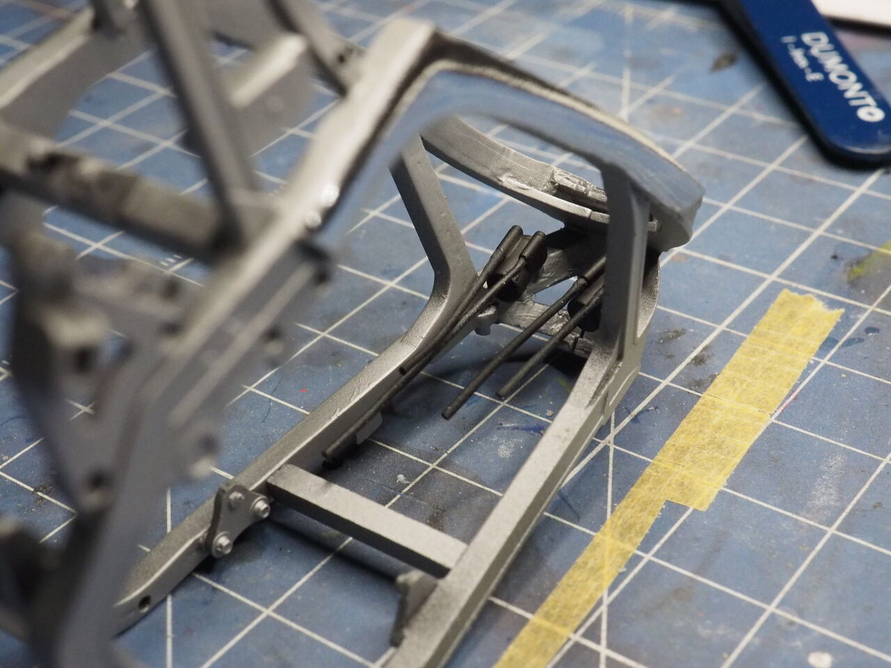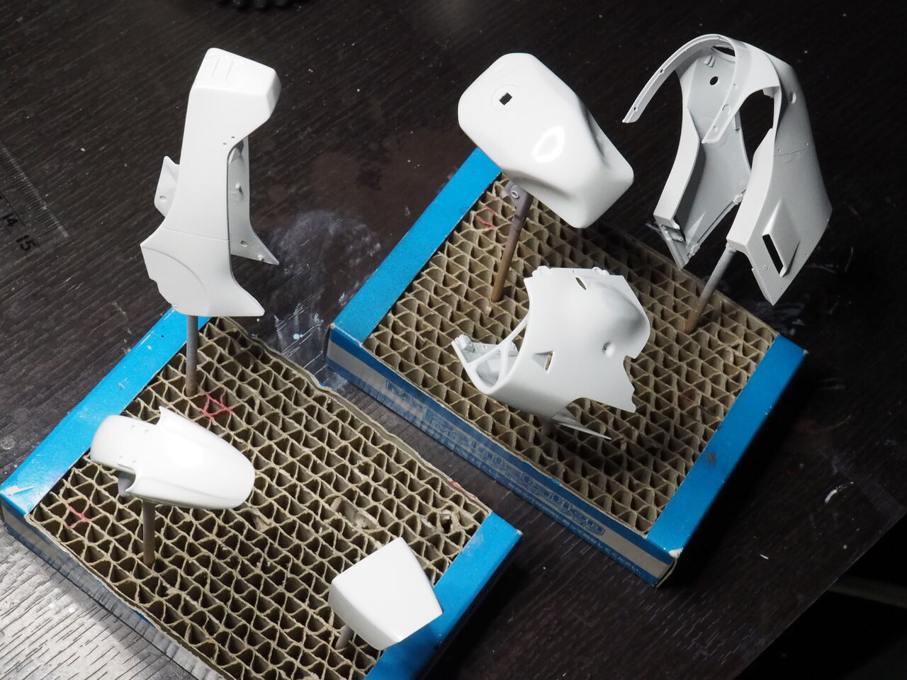 磁石が来てちょっと傷とかも付けちゃったのでカウルはそれからです。内部の細かいパーツやリアタイヤ周りを進めましょう
