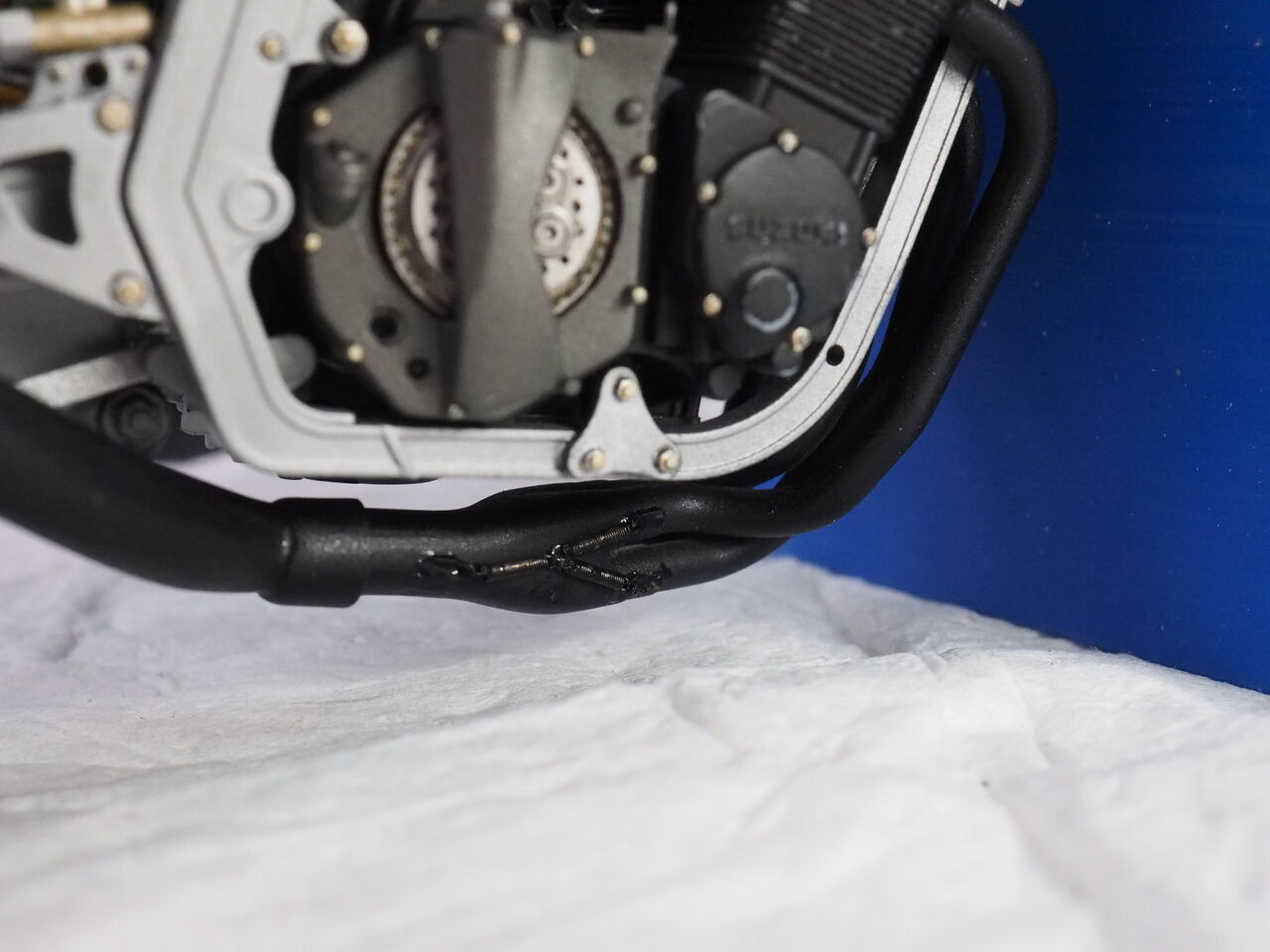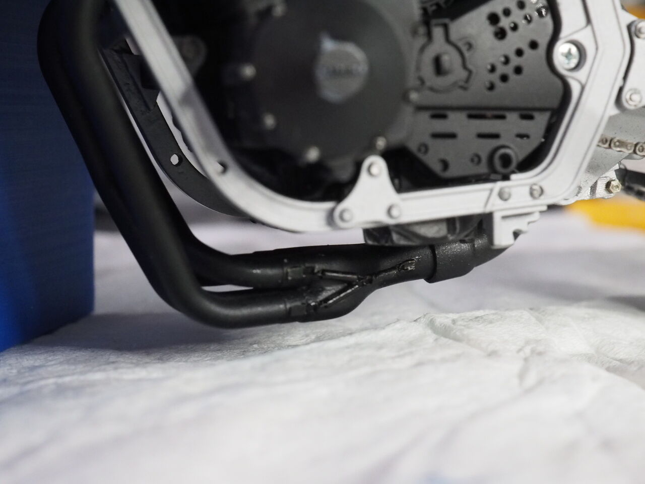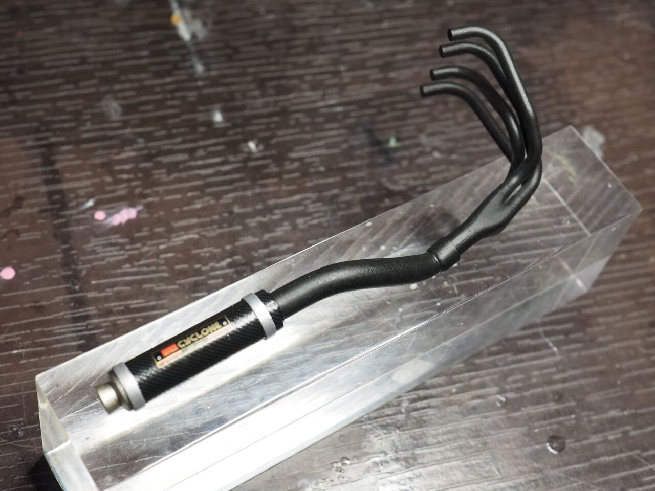 エキパイはブラック。当時のバイクは鉄でしかも梨地っぽくなってます。ブラックを塗装した後、フラットクリアーを原液で遠くから砂吹きしました。