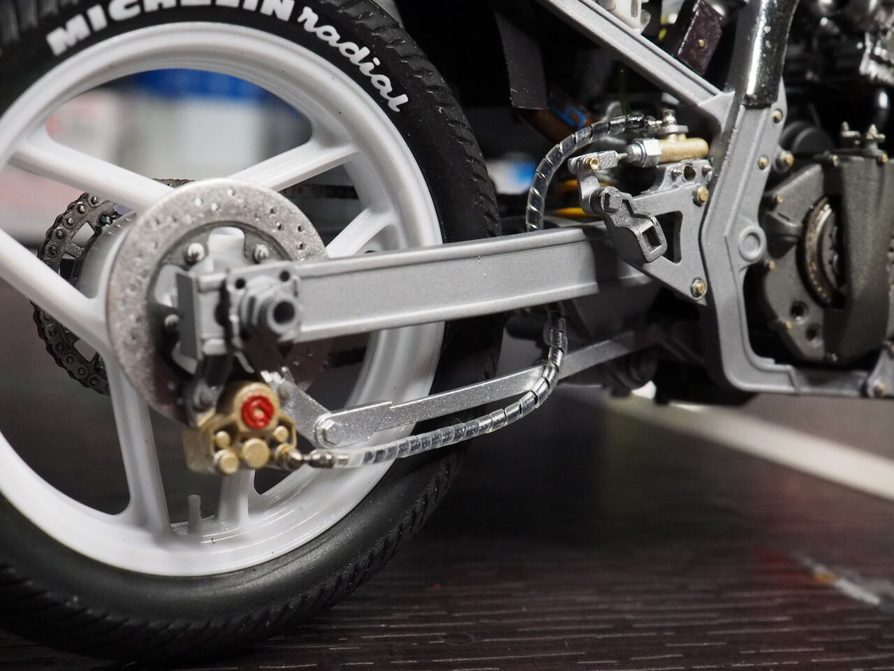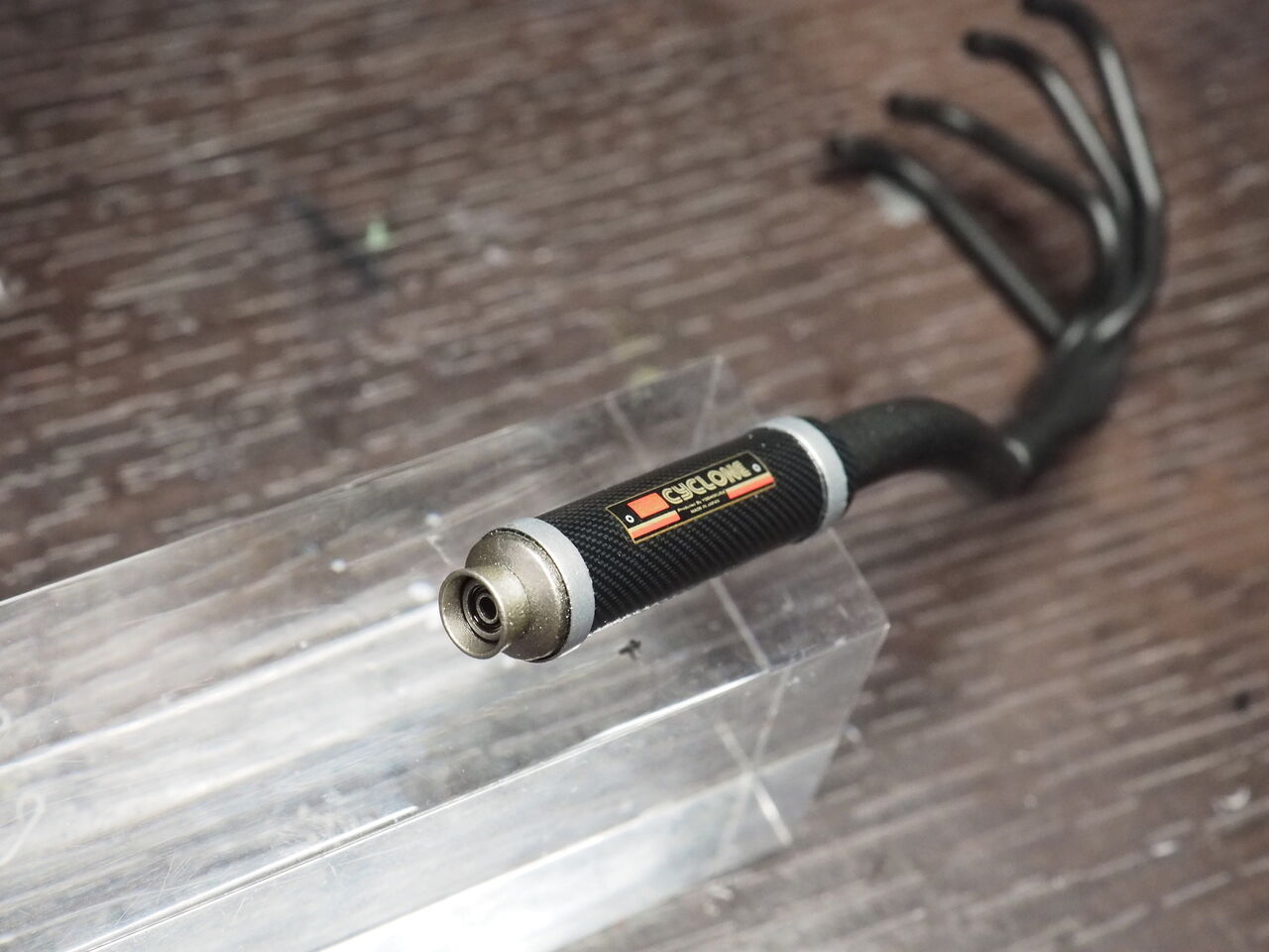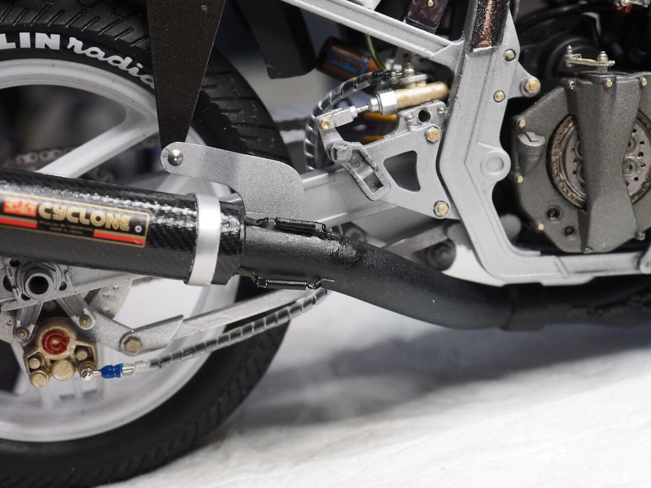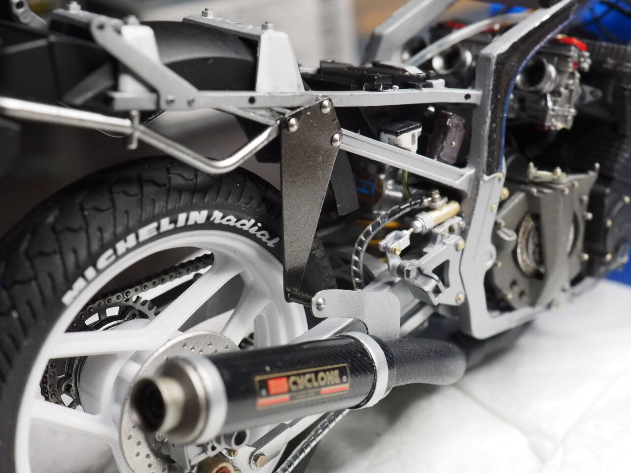 帯をシルバーで塗ってデカールを貼れば「ヨシムラサイクロン」です。カーボン部分はグロスクリアーでコーティングしてあります。