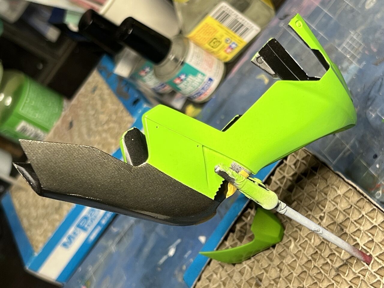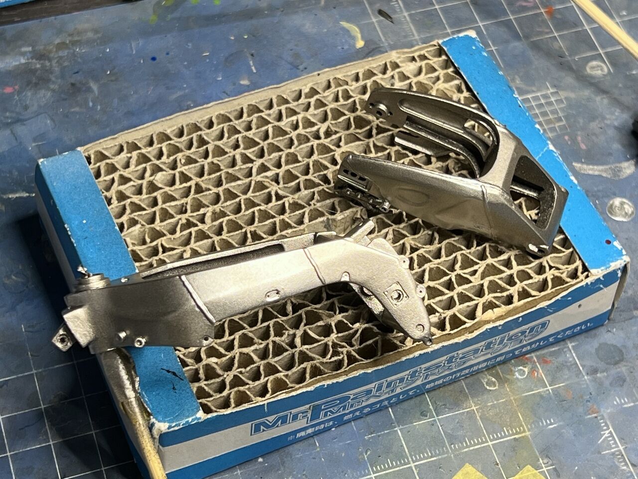 全体を一回ブラックで。その後チタンシルバーで塗ります。最後にクロームで部分的に塗ってあります。実車をみると光の加減か、なにかわかりませんがシルバーっぽい部分とチタンっぽい(イエローっぽい?)所とがありますね。できるだけ・・・写真を見ながらですが・・・再現しましょう・・・