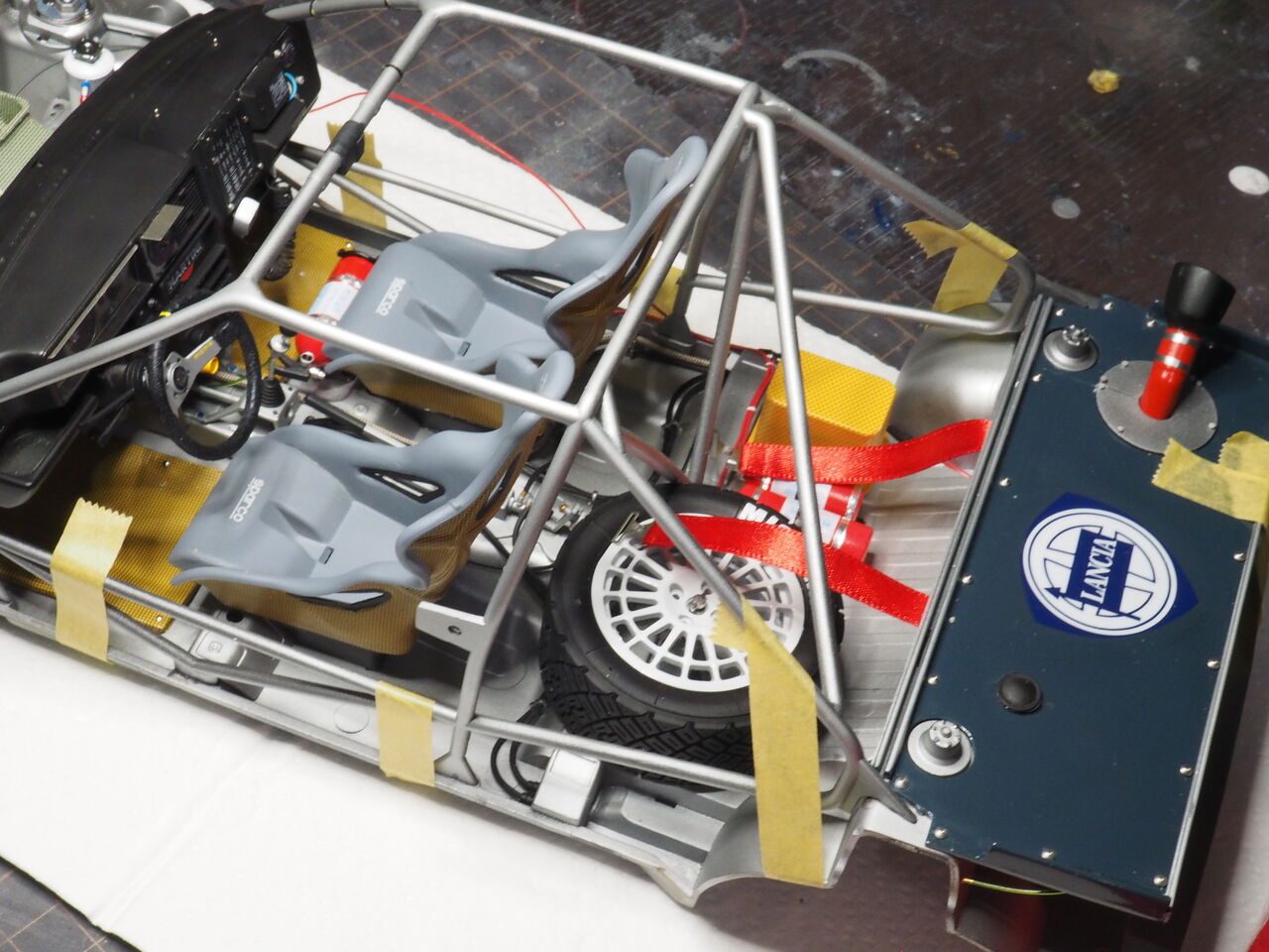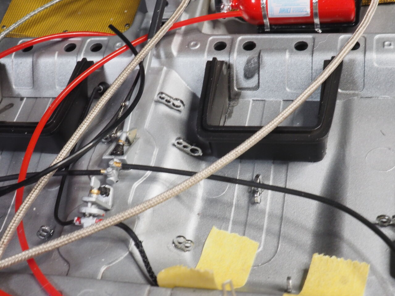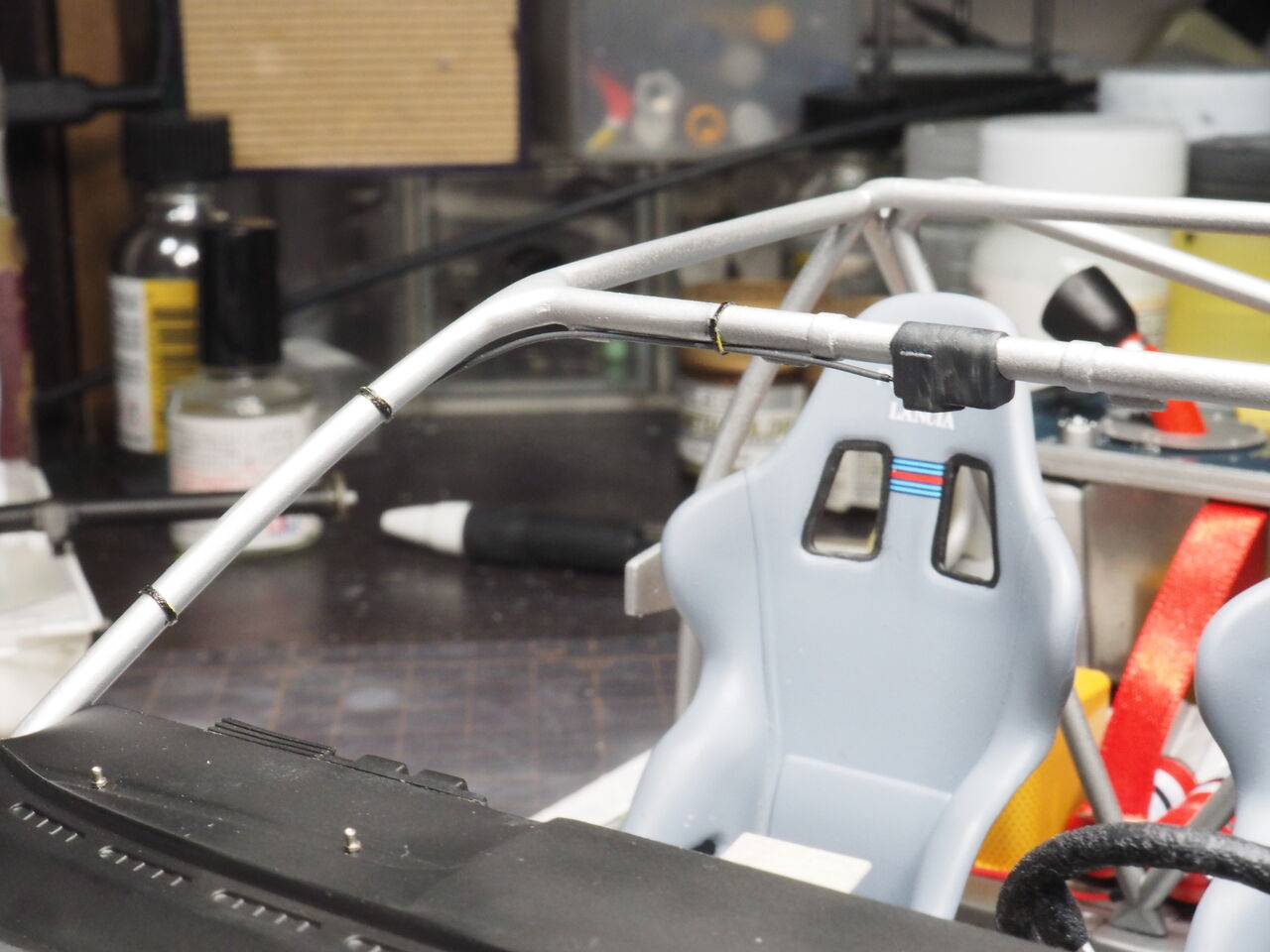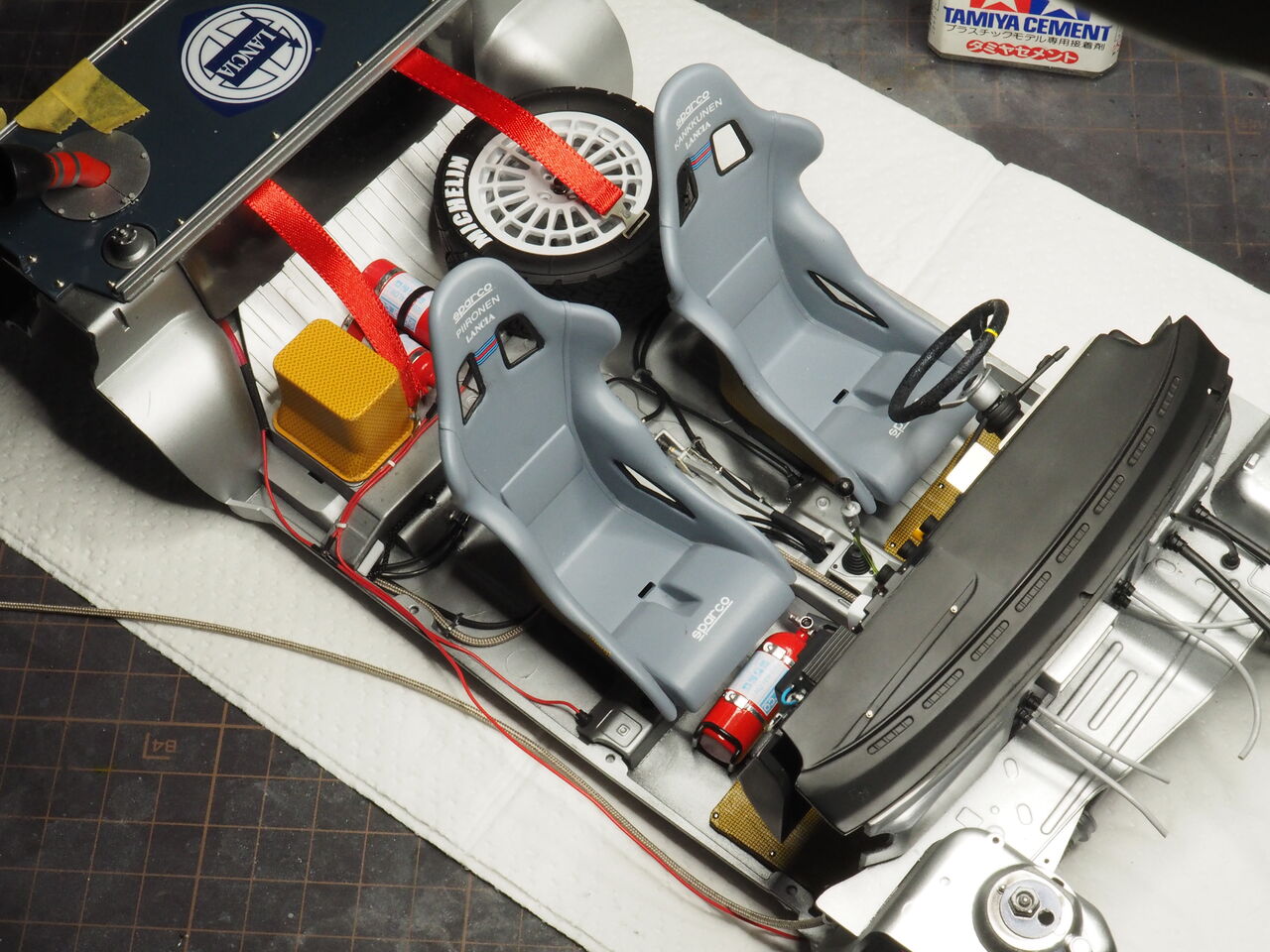 室内はパイピングを少しだけ行うのでそのあと接着します。次回はパイピングと一緒にロールバーも制作しましょう。