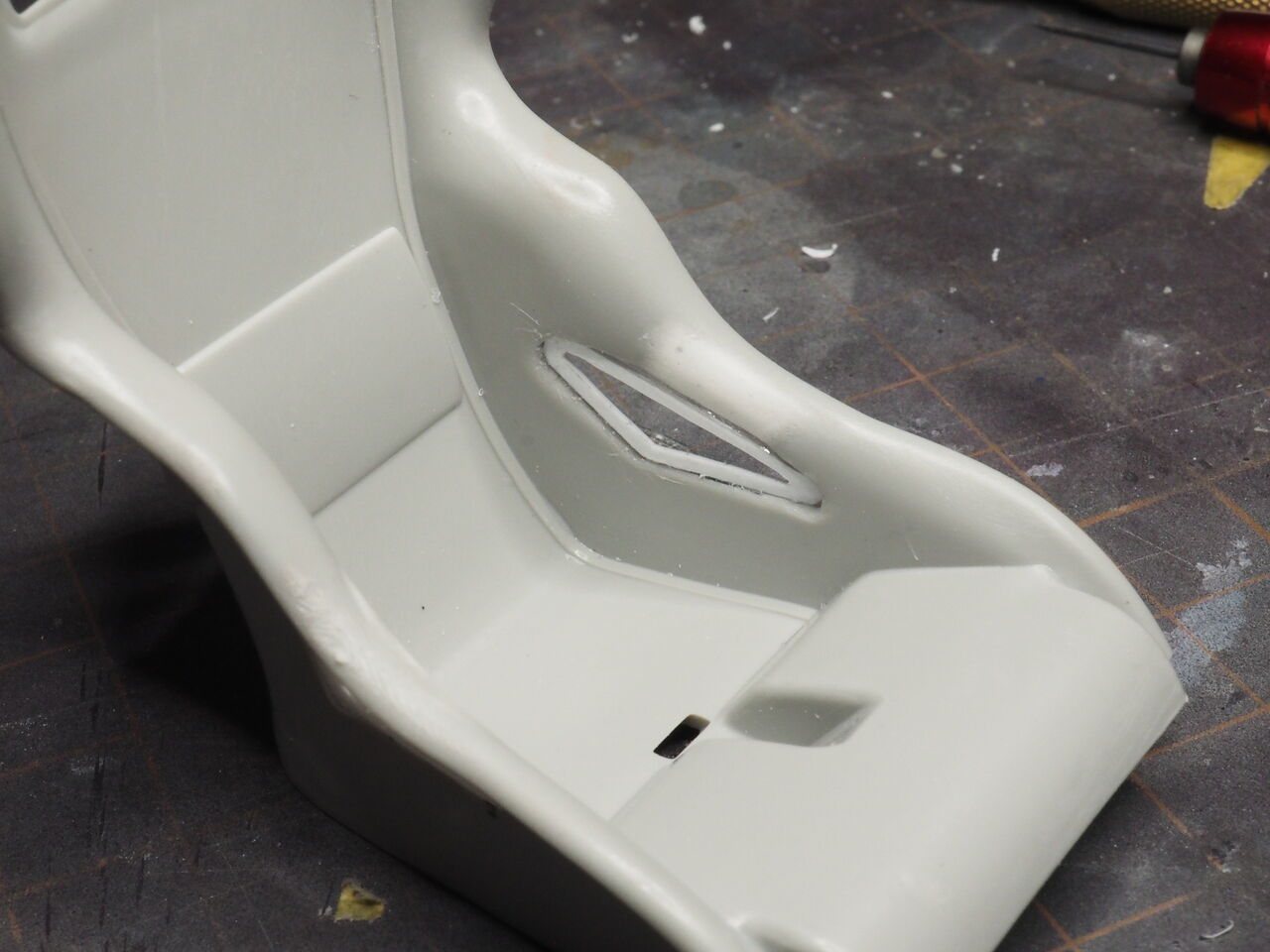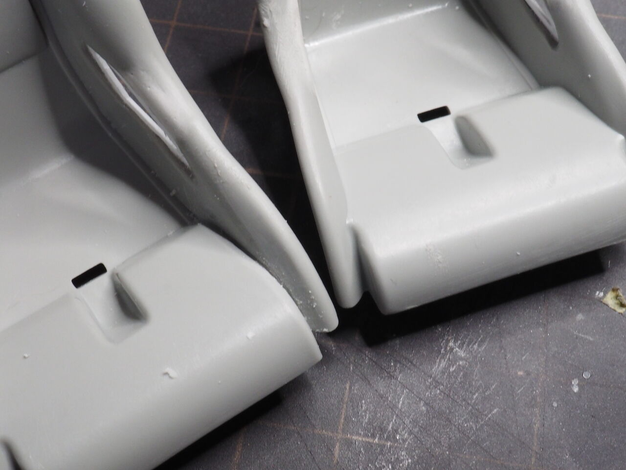 シート座面の横。写真右の様に側面との繋がりが不自然だったので・・写真左のように掘り込み別のモコモコ部分だよ感をだします。