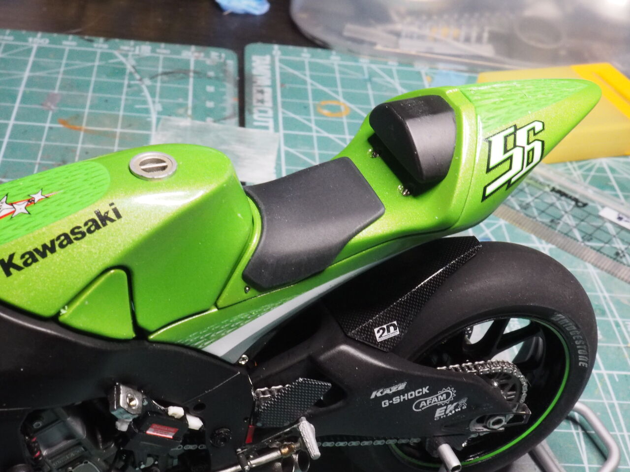シート。ちょっと硬い感じだったのでシートの縁を丸くしてあります。後ろのクッションも側面と前面(ライダーの当たる面)は、どうも材質が違うように見えました。ので、上側面はセミグロスで、前面はフラットで塗り分けました。よーーーーく見ないとどうでも良いところですが・・・