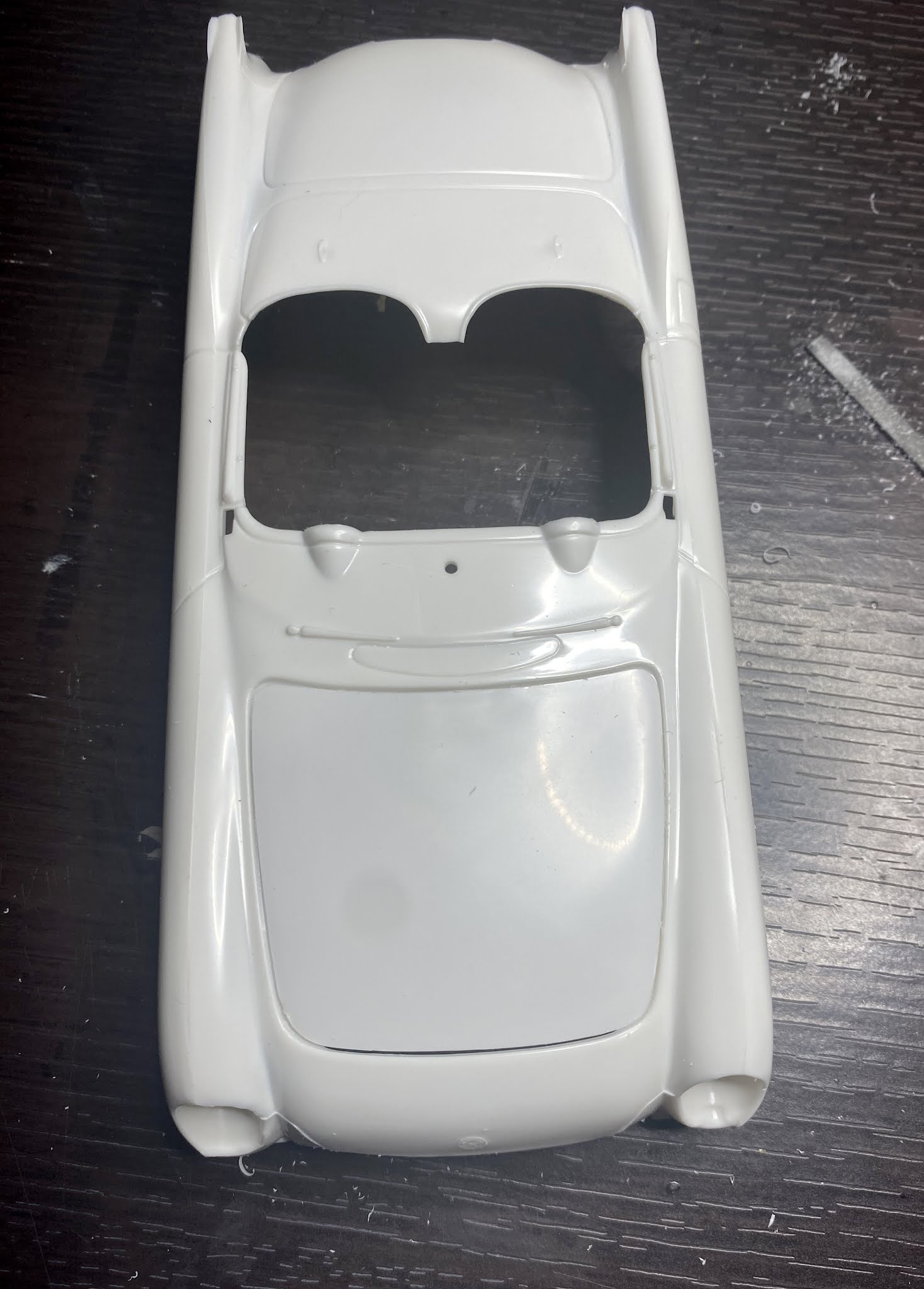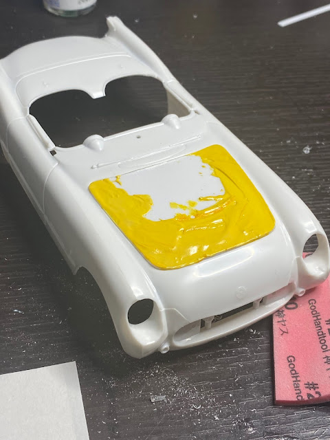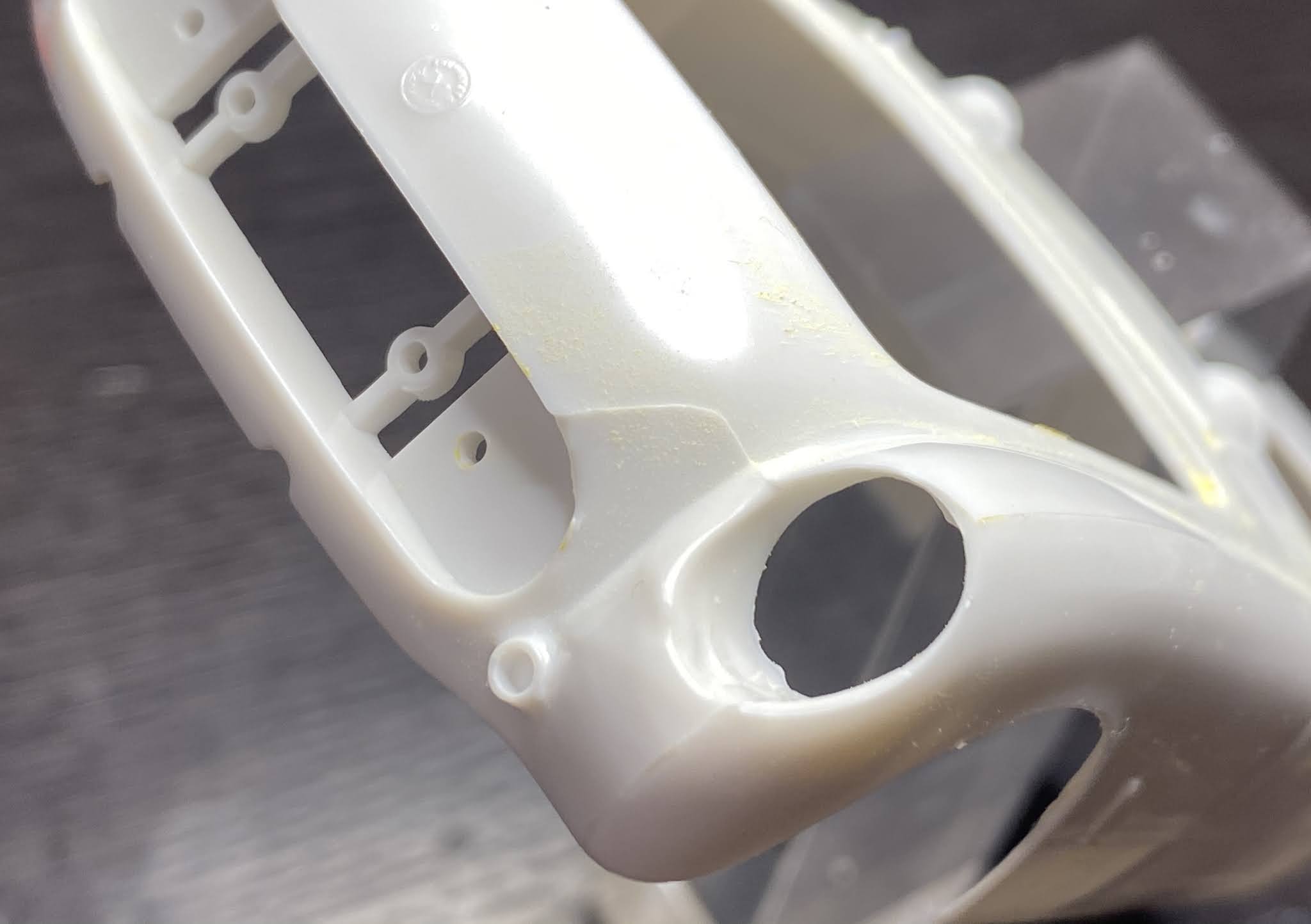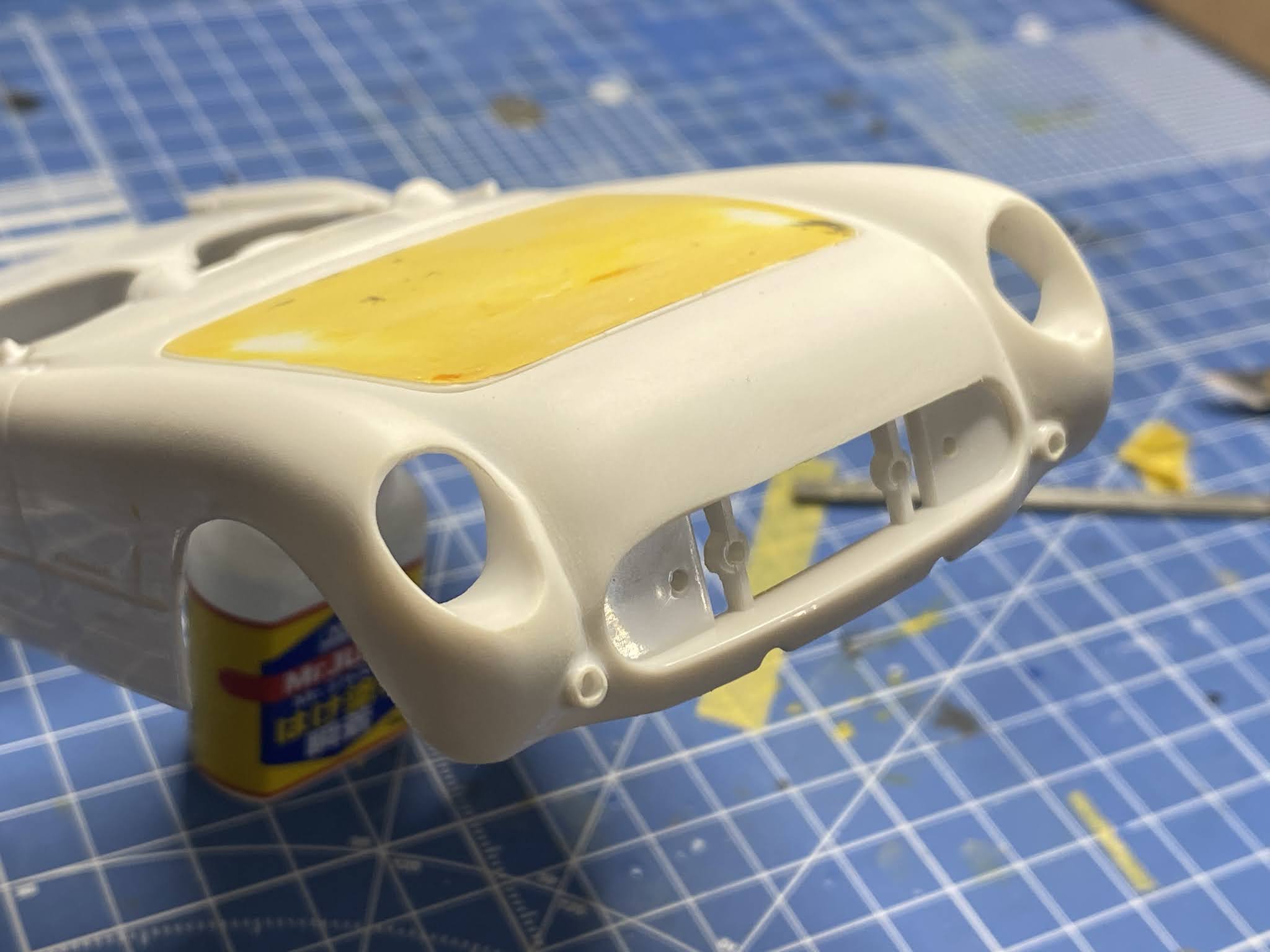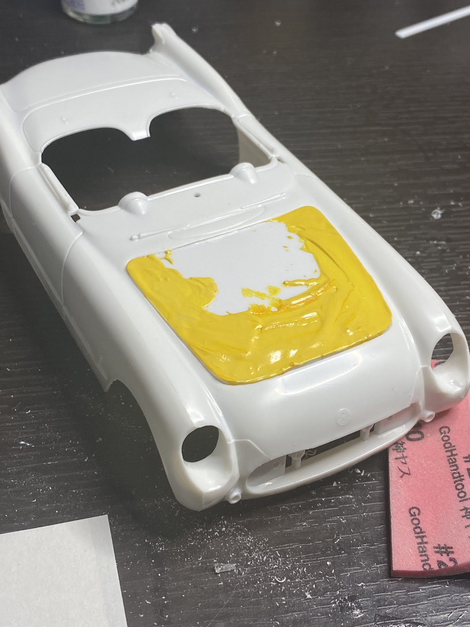 パーティングラインの段差も落ち込んでしまうボンネットも・・・ワイパー?らしきものも完成するんでしょうか・・・