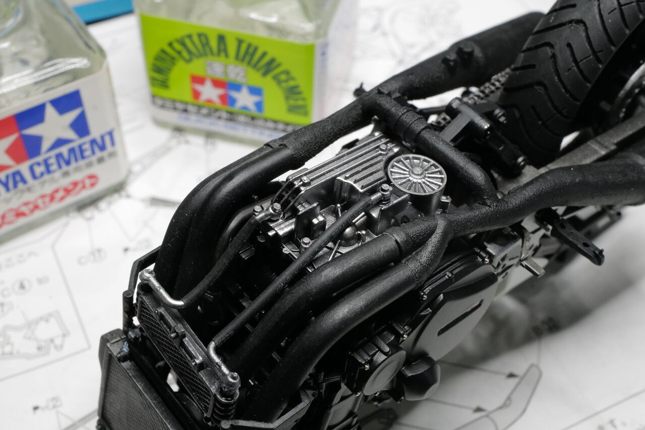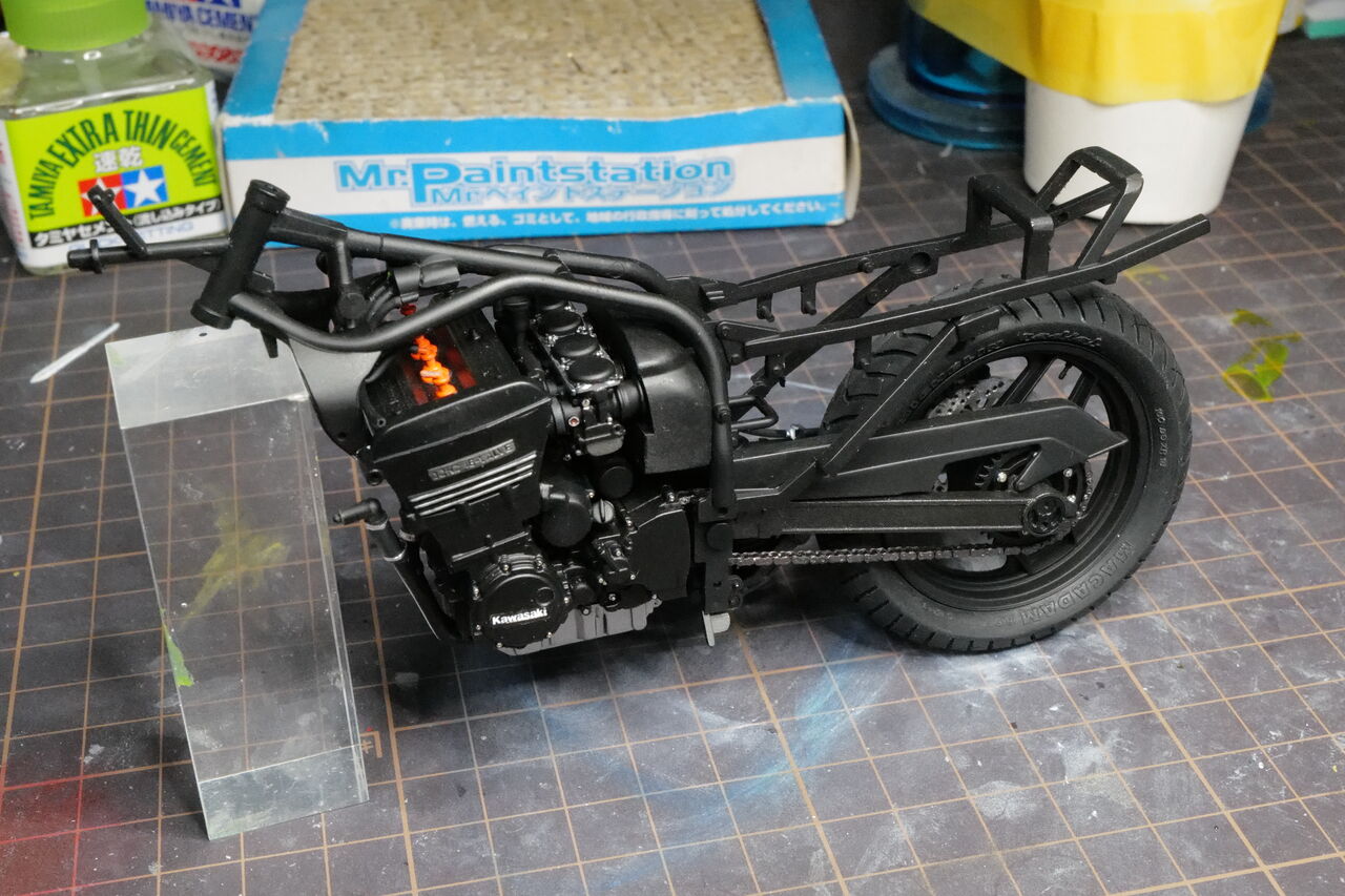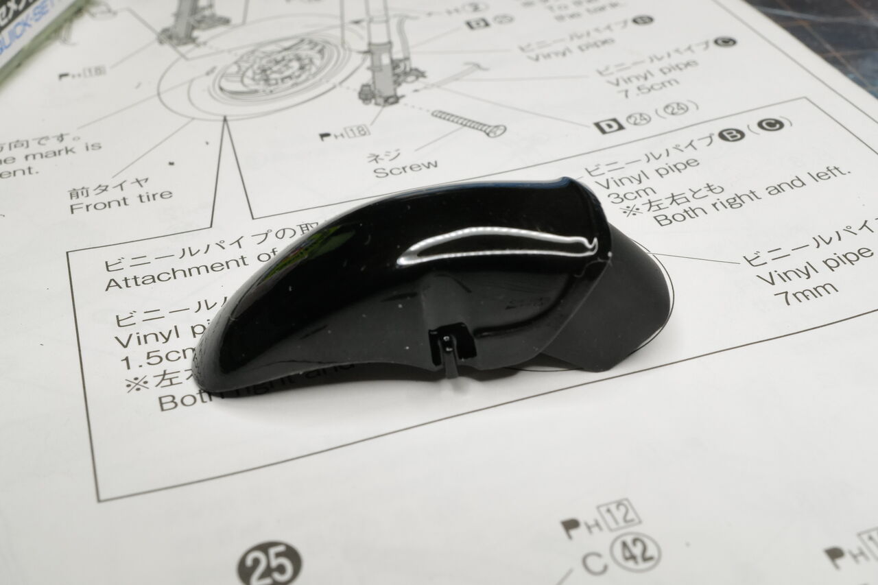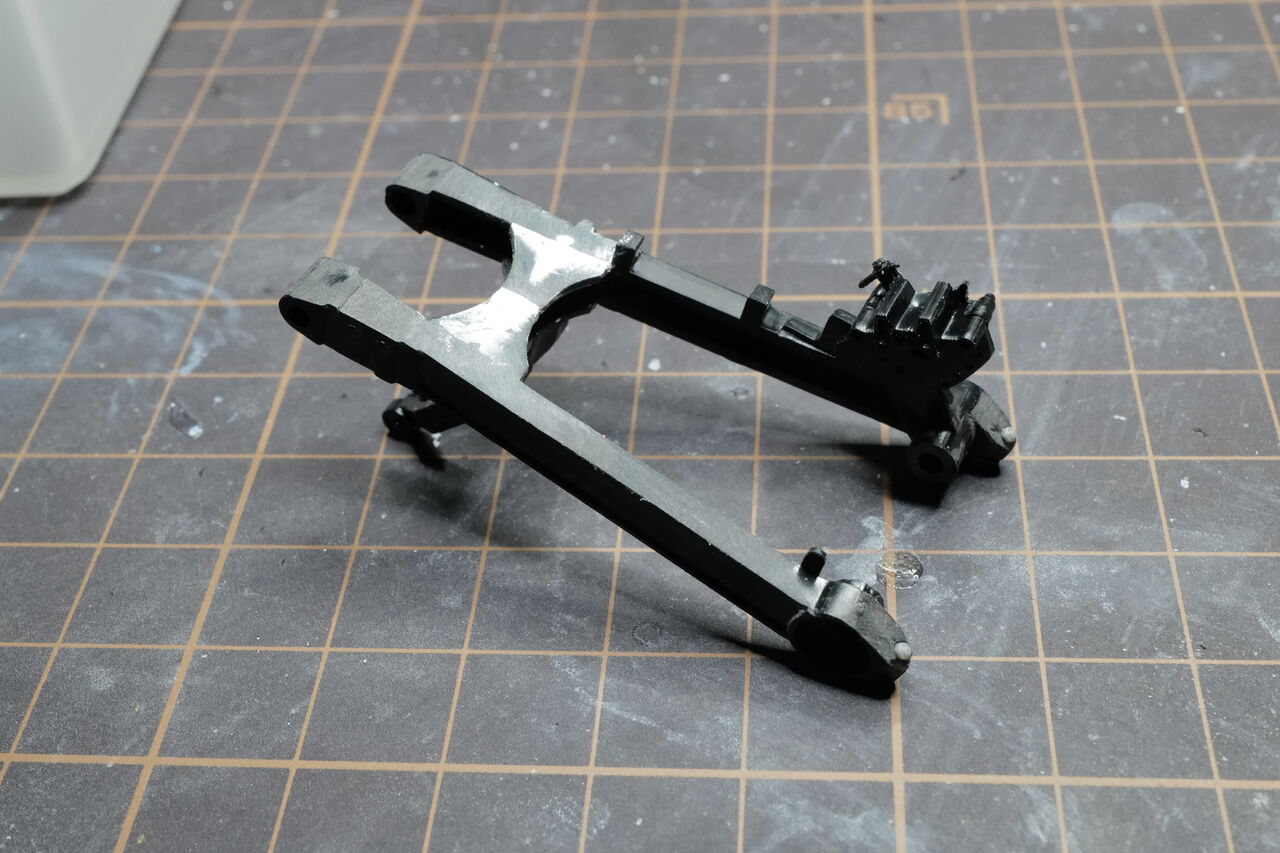 ブラック塗装。今回のブラックはアルクラッドのグロスブラック。本来は金属色の下地用ですが隠蔽力が強く、軽く塗っても綺麗にツヤが出るのでとても使いやすいです。