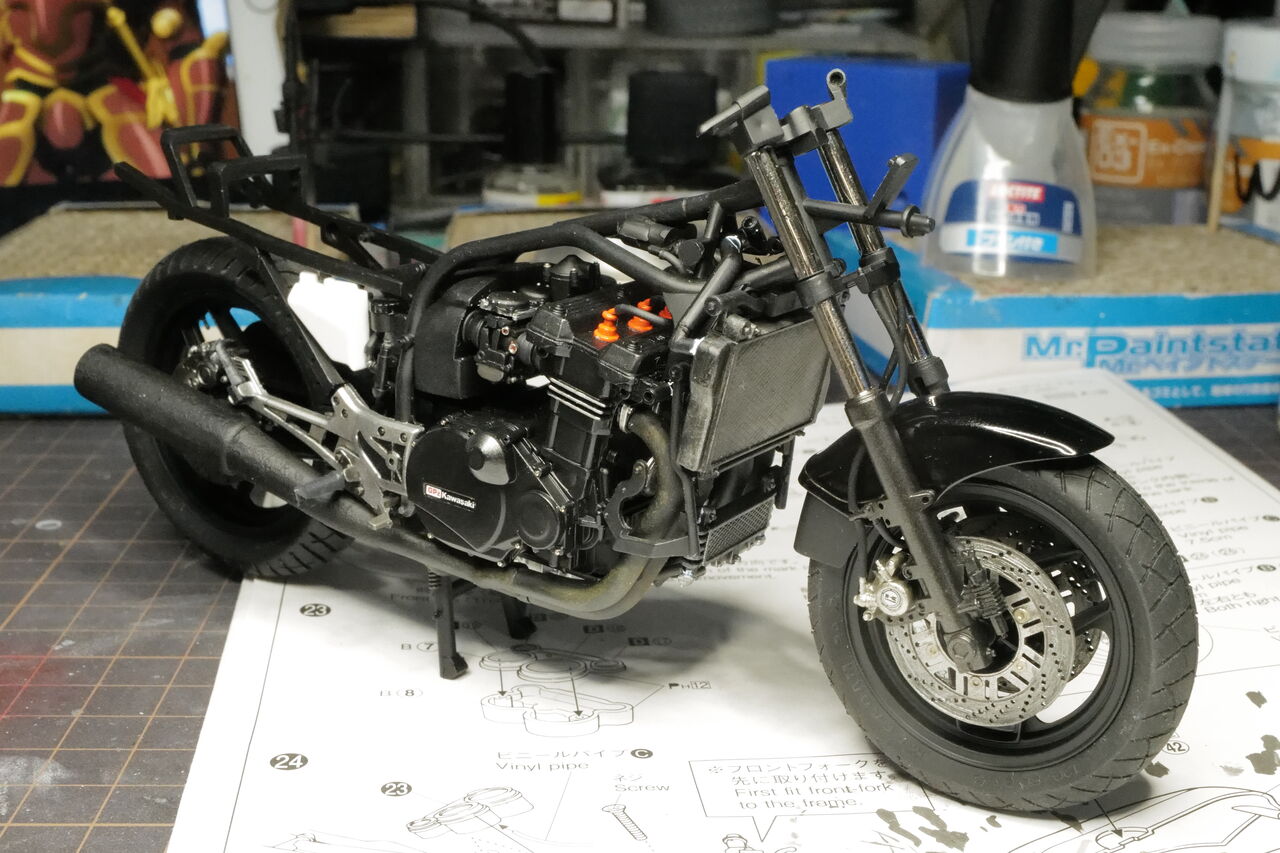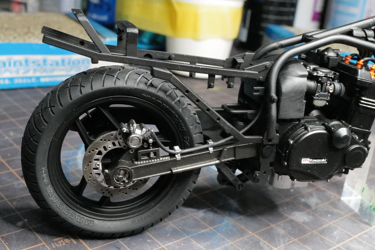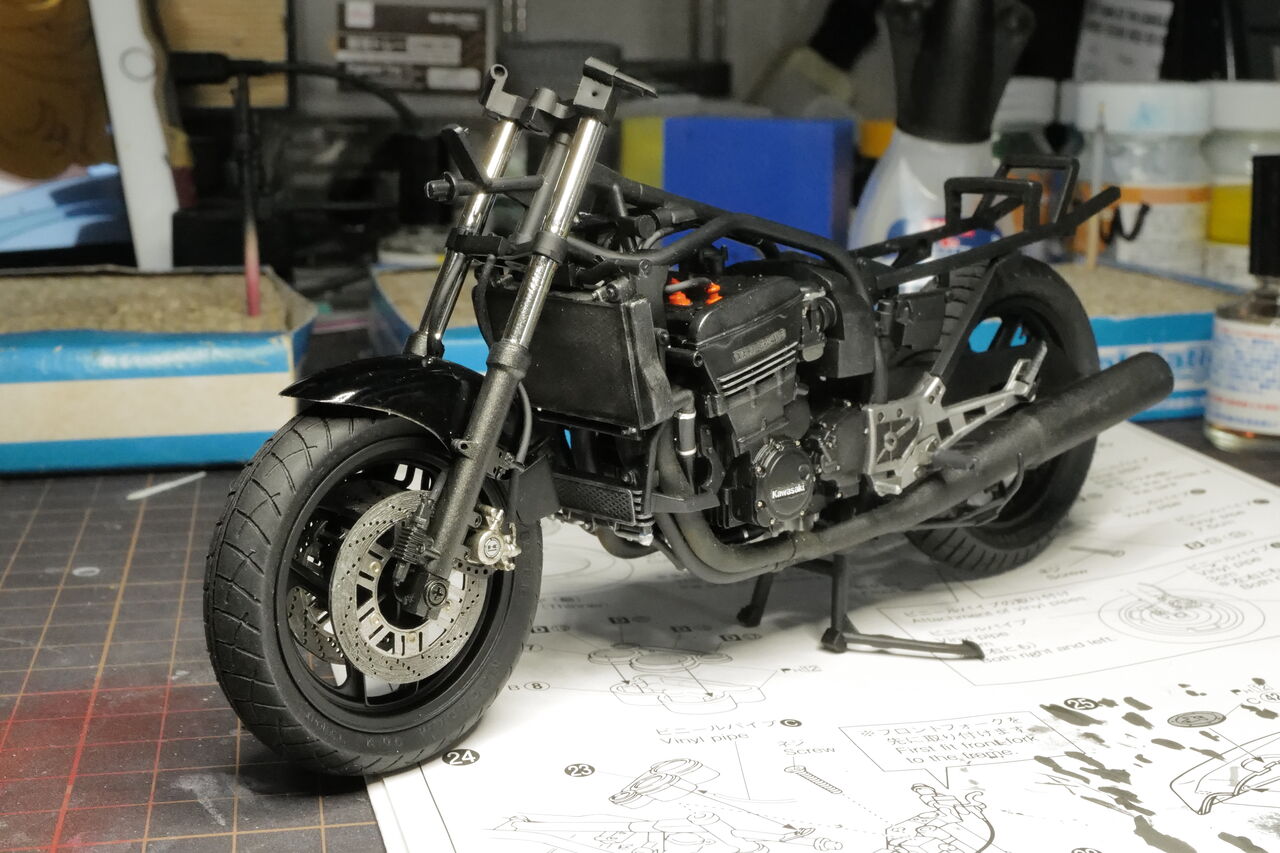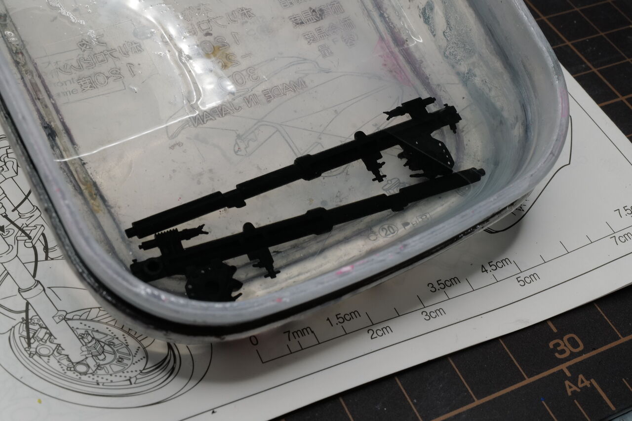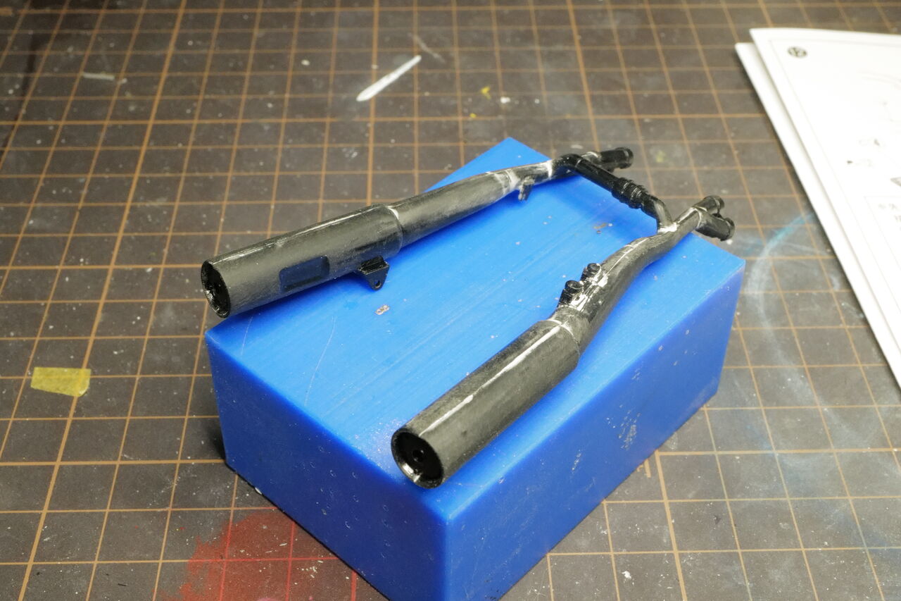 ブラック塗装。今回のブラックはアルクラッドのグロスブラック。本来は金属色の下地用ですが隠蔽力が強く、軽く塗っても綺麗にツヤが出るのでとても使いやすいです。