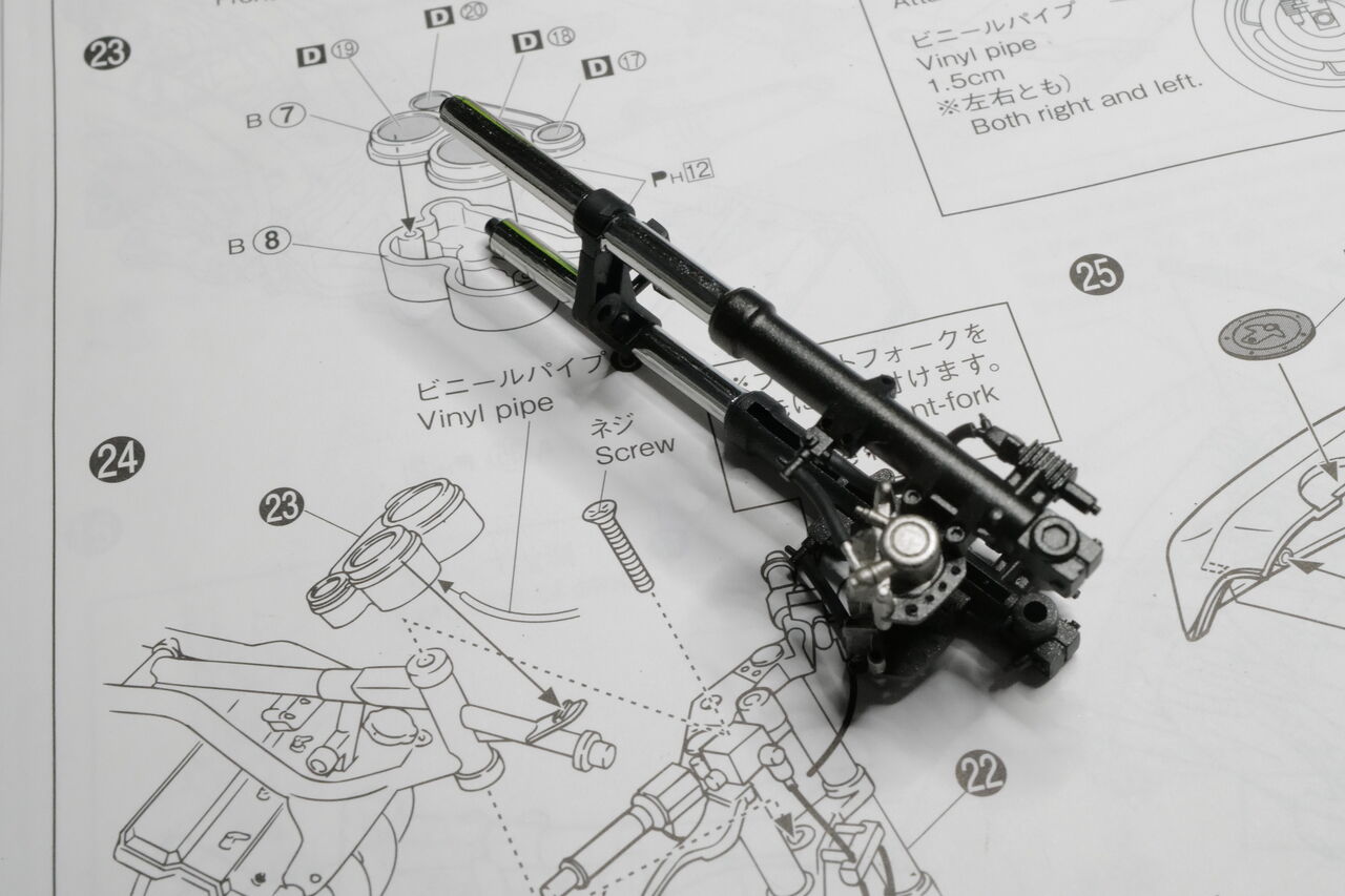 サイドアンダーカウル。これ赤とブラックの境目が綺麗になるように黒のデカールが貼ってあります。先目も綺麗に仕上がって、案外良いアイデアですね。